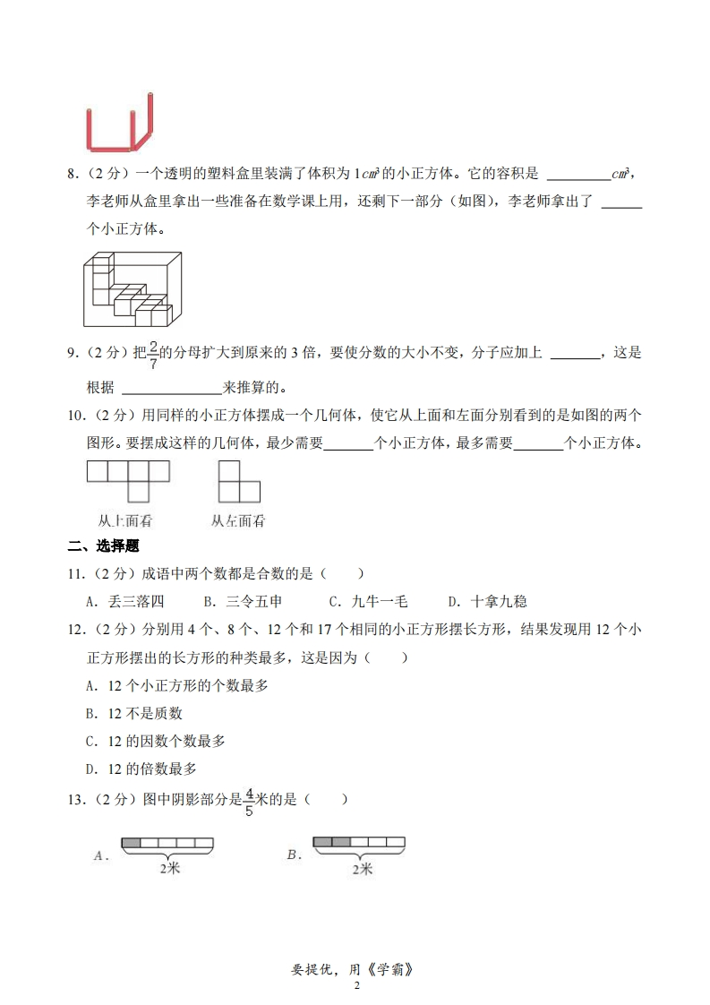 浙江省杭州市临平区2023-2024学年5年级下学期期中数学试卷芝士老师6个月前发布关注私信0.67MB10页672243浙江省杭州市临平区2023-2024学年5年级下学期期中数学试卷此内容为付费资源,请付费后查看会员专属资源学期会员免费研学会员免费您暂无购买权限,请先开通会员开通会员强烈推荐123网盘下载,非会员不限速如果下载链接失效请联系客服补发如需手机上下载打印,请用手机浏览器打开本站付费资源 第1页 / 共10页 第2页 / 共10页 试读已结束,还剩8页,您可下载完整版后进行离线阅读 © 版权声明 1 如果您找不到想要的资料, 点击这儿 可以查看网站使用手册! 2 可能会帮助到你: 网址导航 | 网站入门 | 获取邀请码 3 如果遇到付费才能看或下载的文章,建议您升级本站VIP会员;全站所有资源任意下,免费看。 4本站资源部分来自网络,由多位老师收集整理,如有侵犯你的权益请 联系站长,我们会第一时间进行审核删除。 5 站内资源为网友个人学习或测试研究使用,未经原版权作者许可,禁止用于任何商业途径!请在下载24小时内删除! THE END考试试卷专题五年级资料专区# 真题 这套资料真的不错,快分享给您身边最好的朋友吧^_^点赞243 分享QQ空间微博QQ好友海报分享复制链接收藏 可以按Ctrl+D收藏此页面 HI!请登录 登录 注册 搜索 开启精彩搜索 付费资源会员专属资源学期会员免费研学会员免费强烈推荐123网盘下载,非会员不限速如果下载链接失效请联系客服补发如需手机上下载打印,请用手机浏览器打开本站您暂无购买权限,请先开通会员开通会员默写 (12)高频考点 (1)高分必刷 (0)高中语文 (5)高中英语 (7)高中生物 (5)高中数学 (12)高中地理 (5)高中历史 (5)高中化学 (5)预习 (2)音标 (1)雷锋 (0)阅读 (0)阅兵 (5)钱 (6)量词 (3)部首 (1)逻辑 (12)通用 (0) s_juan1关注 这家伙很懒,什么都没有写... 小吖麻麻关注 这家伙很懒,什么都没有写... kele关注 这家伙很懒,什么都没有写... 燕子关注 这家伙很懒,什么都没有写... 四爷关注 这家伙很懒,什么都没有写... 小豆点sun关注 这家伙很懒,什么都没有写... Mouse Dad关注 这家伙很懒,什么都没有写... kuan关注 这家伙很懒,什么都没有写... 领取5000T网盘资源 百度网盘5000T网红资源 立即领取 在手机上浏览此页面 登录没有账号?立即注册手机号或邮箱图形验证码验证码发送验证码记住登录账号密码登录 登录用户名/手机号/邮箱登录密码图形验证码记住登录找回密码 | 免密登录 登录注册已有账号,立即登录设置用户名手机号图形验证码验证码发送验证码设置密码重复密码邀请码(选填)注册已阅读并同意用户协议、隐私声明