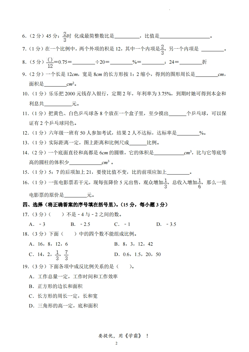 25春人教版6年级下学期期中数学试卷芝士老师6个月前发布关注私信0.41MB6页67619525春人教版6年级下学期期中数学试卷此内容为付费资源,请付费后查看会员专属资源学期会员免费研学会员免费您暂无购买权限,请先开通会员开通会员强烈推荐123网盘下载,非会员不限速如果下载链接失效请联系客服补发如需手机上下载打印,请用手机浏览器打开本站付费资源 第1页 / 共6页 第2页 / 共6页 试读已结束,还剩4页,您可下载完整版后进行离线阅读 © 版权声明 1 如果您找不到想要的资料, 点击这儿 可以查看网站使用手册! 2 可能会帮助到你: 网址导航 | 网站入门 | 获取邀请码 3 如果遇到付费才能看或下载的文章,建议您升级本站VIP会员;全站所有资源任意下,免费看。 4本站资源部分来自网络,由多位老师收集整理,如有侵犯你的权益请 联系站长,我们会第一时间进行审核删除。 5 站内资源为网友个人学习或测试研究使用,未经原版权作者许可,禁止用于任何商业途径!请在下载24小时内删除! THE END考试试卷专题六年级资料专区# 真题 这套资料真的不错,快分享给您身边最好的朋友吧^_^点赞195 分享QQ空间微博QQ好友海报分享复制链接收藏 可以按Ctrl+D收藏此页面 HI!请登录 登录 注册 搜索 开启精彩搜索 付费资源会员专属资源学期会员免费研学会员免费强烈推荐123网盘下载,非会员不限速如果下载链接失效请联系客服补发如需手机上下载打印,请用手机浏览器打开本站您暂无购买权限,请先开通会员开通会员默写 (12)高频考点 (1)高分必刷 (0)高中语文 (5)高中英语 (7)高中生物 (5)高中数学 (12)高中地理 (5)高中历史 (5)高中化学 (5)预习 (2)音标 (1)雷锋 (0)阅读 (0)阅兵 (5)钱 (6)量词 (3)部首 (1)逻辑 (12)通用 (0) 小吖麻麻关注 这家伙很懒,什么都没有写... s_juan1关注 这家伙很懒,什么都没有写... kele关注 这家伙很懒,什么都没有写... 燕子关注 这家伙很懒,什么都没有写... 四爷关注 这家伙很懒,什么都没有写... 小豆点sun关注 这家伙很懒,什么都没有写... Mouse Dad关注 这家伙很懒,什么都没有写... kuan关注 这家伙很懒,什么都没有写... 领取5000T网盘资源 百度网盘5000T网红资源 立即领取 在手机上浏览此页面 登录没有账号?立即注册手机号或邮箱图形验证码验证码发送验证码记住登录账号密码登录 登录用户名/手机号/邮箱登录密码图形验证码记住登录找回密码 | 免密登录 登录注册已有账号,立即登录设置用户名手机号图形验证码验证码发送验证码设置密码重复密码邀请码(选填)注册已阅读并同意用户协议、隐私声明