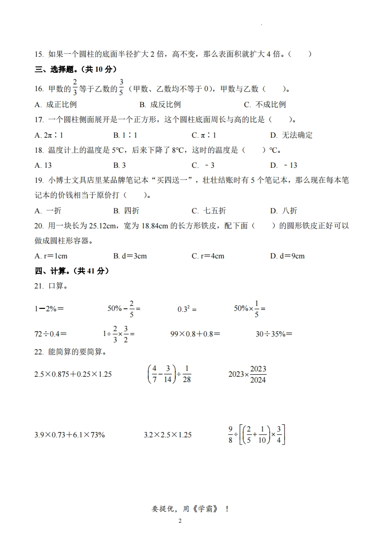 河北省邯郸市武安市人教版6年级下册期中测试数学试卷芝士老师6个月前发布关注私信0.27MB6页684285河北省邯郸市武安市人教版6年级下册期中测试数学试卷此内容为付费资源,请付费后查看会员专属资源学期会员免费研学会员免费您暂无购买权限,请先开通会员开通会员强烈推荐123网盘下载,非会员不限速如果下载链接失效请联系客服补发如需手机上下载打印,请用手机浏览器打开本站付费资源 第1页 / 共6页 第2页 / 共6页 试读已结束,还剩4页,您可下载完整版后进行离线阅读 © 版权声明 1 如果您找不到想要的资料, 点击这儿 可以查看网站使用手册! 2 可能会帮助到你: 网址导航 | 网站入门 | 获取邀请码 3 如果遇到付费才能看或下载的文章,建议您升级本站VIP会员;全站所有资源任意下,免费看。 4本站资源部分来自网络,由多位老师收集整理,如有侵犯你的权益请 联系站长,我们会第一时间进行审核删除。 5 站内资源为网友个人学习或测试研究使用,未经原版权作者许可,禁止用于任何商业途径!请在下载24小时内删除! THE END考试试卷专题六年级资料专区# 真题 这套资料真的不错,快分享给您身边最好的朋友吧^_^点赞285 分享QQ空间微博QQ好友海报分享复制链接收藏 可以按Ctrl+D收藏此页面 HI!请登录 登录 注册 搜索 开启精彩搜索 付费资源会员专属资源学期会员免费研学会员免费强烈推荐123网盘下载,非会员不限速如果下载链接失效请联系客服补发如需手机上下载打印,请用手机浏览器打开本站您暂无购买权限,请先开通会员开通会员默写 (12)高频考点 (1)高分必刷 (0)高中语文 (5)高中英语 (7)高中生物 (5)高中数学 (12)高中地理 (5)高中历史 (5)高中化学 (5)预习 (2)音标 (1)雷锋 (0)阅读 (0)阅兵 (5)钱 (6)量词 (3)部首 (1)逻辑 (12)通用 (0) s_juan1关注 这家伙很懒,什么都没有写... 小吖麻麻关注 这家伙很懒,什么都没有写... kele关注 这家伙很懒,什么都没有写... 燕子关注 这家伙很懒,什么都没有写... 四爷关注 这家伙很懒,什么都没有写... 小豆点sun关注 这家伙很懒,什么都没有写... Mouse Dad关注 这家伙很懒,什么都没有写... kuan关注 这家伙很懒,什么都没有写... 领取5000T网盘资源 百度网盘5000T网红资源 立即领取 在手机上浏览此页面 登录没有账号?立即注册手机号或邮箱图形验证码验证码发送验证码记住登录账号密码登录 登录用户名/手机号/邮箱登录密码图形验证码记住登录找回密码 | 免密登录 登录注册已有账号,立即登录设置用户名手机号图形验证码验证码发送验证码设置密码重复密码邀请码(选填)注册已阅读并同意用户协议、隐私声明