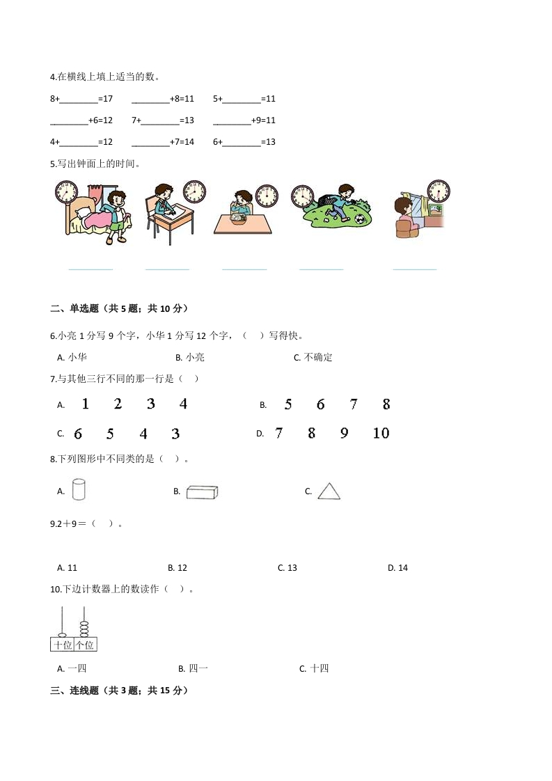 人教(新课程标准)一年级数学上册期末要点拔高卷(六)(含答案)芝士老师1年前发布关注私信0.29MB9页618258人教(新课程标准)一年级数学上册期末要点拔高卷(六)(含答案)此内容为免费资源,请登录后查看0积分 登录查看强烈推荐123网盘下载,非会员不限速如果下载链接失效请联系客服补发如需手机上下载打印,请用手机浏览器打开本站免费资源 第1页 / 共9页 第2页 / 共9页 第3页 / 共9页 该文档为免费文档,您可直接下载完整版进行阅读 © 版权声明 1 如果您找不到想要的资料, 点击这儿 可以查看网站使用手册! 2 可能会帮助到你: 网址导航 | 网站入门 | 获取邀请码 3 如果遇到付费才能看或下载的文章,建议您升级本站VIP会员;全站所有资源任意下,免费看。 4本站资源部分来自网络,由多位老师收集整理,如有侵犯你的权益请 联系站长,我们会第一时间进行审核删除。 5 站内资源为网友个人学习或测试研究使用,未经原版权作者许可,禁止用于任何商业途径!请在下载24小时内删除! THE END一年级资料专区 这套资料真的不错,快分享给您身边最好的朋友吧^_^点赞258 分享QQ空间微博QQ好友海报分享复制链接收藏 可以按Ctrl+D收藏此页面 HI!请登录 登录 注册 搜索 开启精彩搜索 免费内容强烈推荐123网盘下载,非会员不限速如果下载链接失效请联系客服补发如需手机上下载打印,请用手机浏览器打开本站 登录查看默写 (12)高频考点 (1)高分必刷 (0)高中语文 (5)高中英语 (7)高中生物 (5)高中数学 (12)高中地理 (5)高中历史 (5)高中化学 (5)预习 (2)音标 (1)雷锋 (0)阅读 (0)阅兵 (5)钱 (6)量词 (3)部首 (1)逻辑 (12)通用 (0) 小吖麻麻关注 这家伙很懒,什么都没有写... evawawawa关注 这家伙很懒,什么都没有写... s_juan1关注 这家伙很懒,什么都没有写... kele关注 这家伙很懒,什么都没有写... 燕子关注 这家伙很懒,什么都没有写... 四爷关注 这家伙很懒,什么都没有写... 小豆点sun关注 这家伙很懒,什么都没有写... Mouse Dad关注 这家伙很懒,什么都没有写... 领取5000T网盘资源 百度网盘5000T网红资源 立即领取 在手机上浏览此页面 登录没有账号?立即注册手机号或邮箱图形验证码验证码发送验证码记住登录账号密码登录 登录用户名/手机号/邮箱登录密码图形验证码记住登录找回密码 | 免密登录 登录注册已有账号,立即登录设置用户名手机号图形验证码验证码发送验证码设置密码重复密码邀请码(选填)注册已阅读并同意用户协议、隐私声明