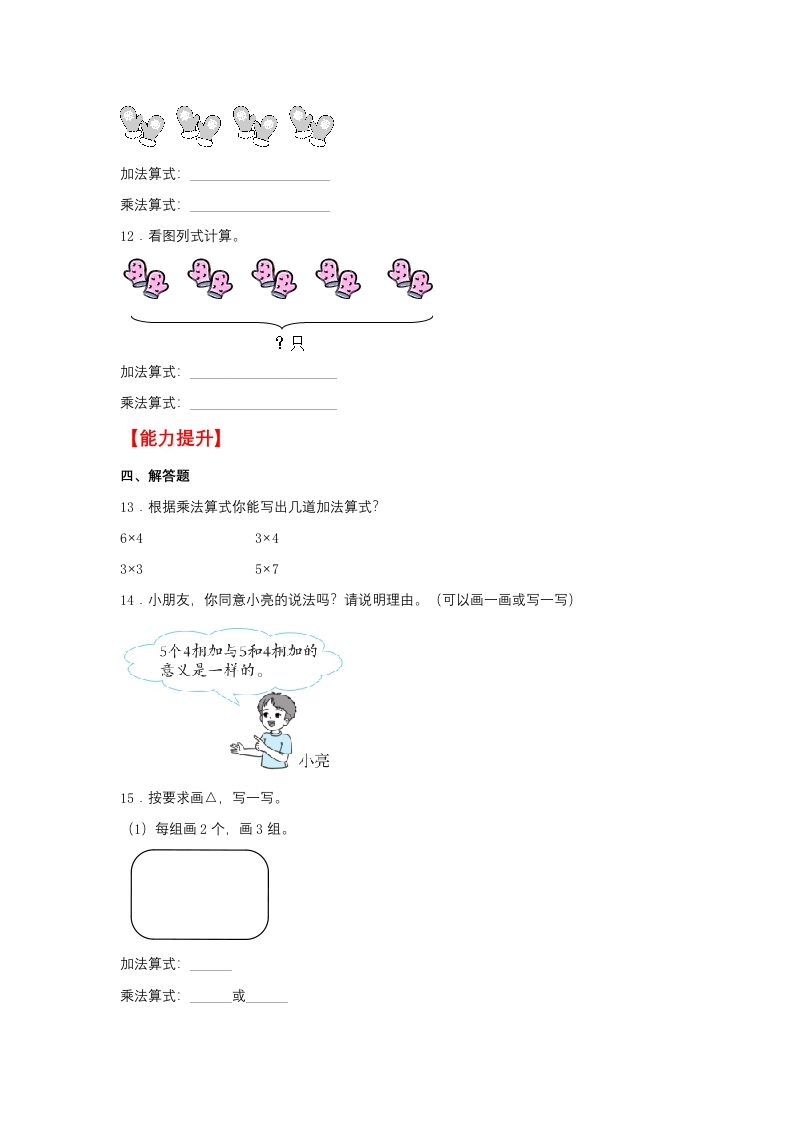 【分层作业】4.1乘法的初步认识(同步练习)二年级上册数学同步课时练(人教版,含答案)芝士老师1年前发布关注私信99.91KB6页706268【分层作业】4.1乘法的初步认识(同步练习)二年级上册数学同步课时练(人教版,含答案)此内容为免费资源,请登录后查看0积分 登录查看强烈推荐123网盘下载,非会员不限速如果下载链接失效请联系客服补发如需手机上下载打印,请用手机浏览器打开本站免费资源 第1页 / 共6页 第2页 / 共6页 第3页 / 共6页 该文档为免费文档,您可直接下载完整版进行阅读 © 版权声明 1 如果您找不到想要的资料, 点击这儿 可以查看网站使用手册! 2 可能会帮助到你: 网址导航 | 网站入门 | 获取邀请码 3 如果遇到付费才能看或下载的文章,建议您升级本站VIP会员;全站所有资源任意下,免费看。 4本站资源部分来自网络,由多位老师收集整理,如有侵犯你的权益请 联系站长,我们会第一时间进行审核删除。 5 站内资源为网友个人学习或测试研究使用,未经原版权作者许可,禁止用于任何商业途径!请在下载24小时内删除! THE END二年级资料专区 这套资料真的不错,快分享给您身边最好的朋友吧^_^点赞268 分享QQ空间微博QQ好友海报分享复制链接收藏 可以按Ctrl+D收藏此页面 HI!请登录 登录 注册 搜索 开启精彩搜索 免费内容强烈推荐123网盘下载,非会员不限速如果下载链接失效请联系客服补发如需手机上下载打印,请用手机浏览器打开本站 登录查看默写 (12)高频考点 (1)高分必刷 (0)高中语文 (5)高中英语 (7)高中生物 (5)高中数学 (12)高中地理 (5)高中历史 (5)高中化学 (5)预习 (2)音标 (1)雷锋 (0)阅读 (0)阅兵 (5)钱 (6)量词 (3)部首 (1)逻辑 (12)通用 (0) 小吖麻麻关注 这家伙很懒,什么都没有写... s_juan1关注 这家伙很懒,什么都没有写... kele关注 这家伙很懒,什么都没有写... 燕子关注 这家伙很懒,什么都没有写... 四爷关注 这家伙很懒,什么都没有写... 小豆点sun关注 这家伙很懒,什么都没有写... Mouse Dad关注 这家伙很懒,什么都没有写... kuan关注 这家伙很懒,什么都没有写... 领取5000T网盘资源 百度网盘5000T网红资源 立即领取 在手机上浏览此页面 登录没有账号?立即注册手机号或邮箱图形验证码验证码发送验证码记住登录账号密码登录 登录用户名/手机号/邮箱登录密码图形验证码记住登录找回密码 | 免密登录 登录注册已有账号,立即登录设置用户名手机号图形验证码验证码发送验证码设置密码重复密码邀请码(选填)注册已阅读并同意用户协议、隐私声明