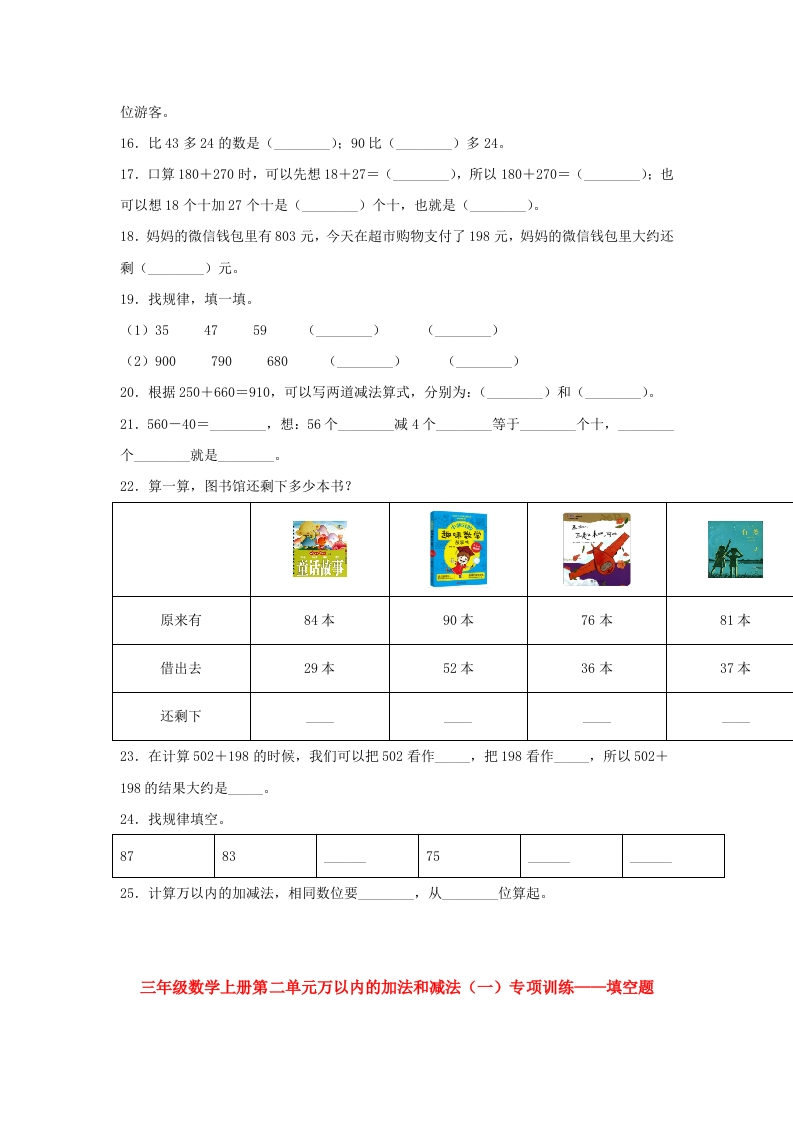 【题型专项特训】三年级数学上册第二单元万以内的加法和减法(一)专项训练——填空题(人教版,含答案)芝士老师1年前发布关注私信0.18MB5页723268【题型专项特训】三年级数学上册第二单元万以内的加法和减法(一)专项训练——填空题(人教版,含答案)此内容为免费资源,请登录后查看0积分 登录查看强烈推荐123网盘下载,非会员不限速如果下载链接失效请联系客服补发如需手机上下载打印,请用手机浏览器打开本站免费资源 第1页 / 共5页 第2页 / 共5页 第3页 / 共5页 该文档为免费文档,您可直接下载完整版进行阅读 © 版权声明 1 如果您找不到想要的资料, 点击这儿 可以查看网站使用手册! 2 可能会帮助到你: 网址导航 | 网站入门 | 获取邀请码 3 如果遇到付费才能看或下载的文章,建议您升级本站VIP会员;全站所有资源任意下,免费看。 4本站资源部分来自网络,由多位老师收集整理,如有侵犯你的权益请 联系站长,我们会第一时间进行审核删除。 5 站内资源为网友个人学习或测试研究使用,未经原版权作者许可,禁止用于任何商业途径!请在下载24小时内删除! THE END三年级资料专区 这套资料真的不错,快分享给您身边最好的朋友吧^_^点赞268 分享QQ空间微博QQ好友海报分享复制链接收藏 可以按Ctrl+D收藏此页面 HI!请登录 登录 注册 搜索 开启精彩搜索 免费内容强烈推荐123网盘下载,非会员不限速如果下载链接失效请联系客服补发如需手机上下载打印,请用手机浏览器打开本站 登录查看默写 (12)高频考点 (1)高分必刷 (0)高中语文 (5)高中英语 (7)高中生物 (5)高中数学 (12)高中地理 (5)高中历史 (5)高中化学 (5)预习 (2)音标 (1)雷锋 (0)阅读 (0)阅兵 (5)钱 (6)量词 (3)部首 (1)逻辑 (12)通用 (0) 小吖麻麻关注 这家伙很懒,什么都没有写... s_juan1关注 这家伙很懒,什么都没有写... kuan关注 这家伙很懒,什么都没有写... evawawawa关注 这家伙很懒,什么都没有写... kele关注 这家伙很懒,什么都没有写... 燕子关注 这家伙很懒,什么都没有写... 四爷关注 这家伙很懒,什么都没有写... 小豆点sun关注 这家伙很懒,什么都没有写... 领取5000T网盘资源 百度网盘5000T网红资源 立即领取 在手机上浏览此页面 登录没有账号?立即注册手机号或邮箱图形验证码验证码发送验证码记住登录账号密码登录 登录用户名/手机号/邮箱登录密码图形验证码记住登录找回密码 | 免密登录 登录注册已有账号,立即登录设置用户名手机号图形验证码验证码发送验证码设置密码重复密码邀请码(选填)注册已阅读并同意用户协议、隐私声明