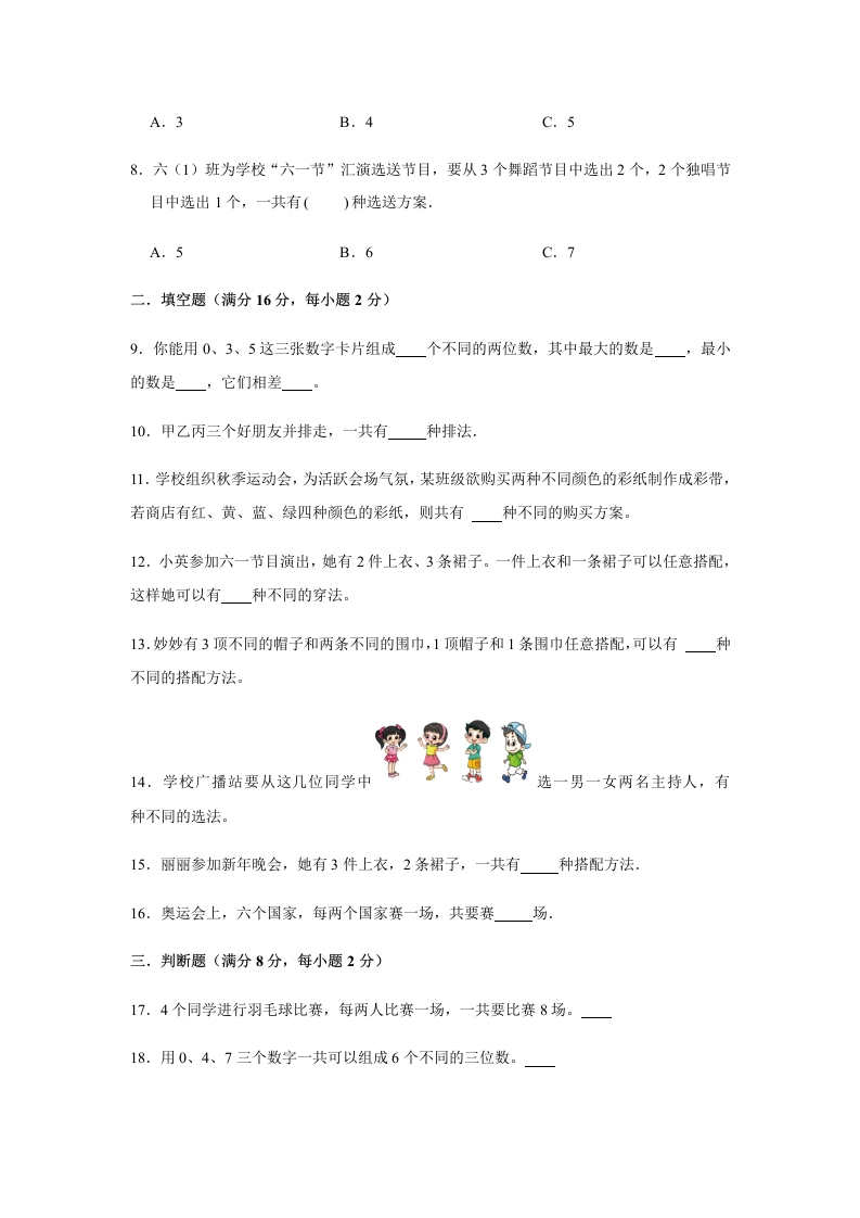 【分层训练】三年级下册数学单元测试-第八单元数学广角——搭配(二)(培优卷)人教版(含答案)芝士老师1年前发布关注私信0.39MB12页687220【分层训练】三年级下册数学单元测试-第八单元数学广角——搭配(二)(培优卷)人教版(含答案)此内容为免费资源,请登录后查看0积分 登录查看强烈推荐123网盘下载,非会员不限速如果下载链接失效请联系客服补发如需手机上下载打印,请用手机浏览器打开本站免费资源 第1页 / 共12页 第2页 / 共12页 第3页 / 共12页 该文档为免费文档,您可直接下载完整版进行阅读 © 版权声明 1 如果您找不到想要的资料, 点击这儿 可以查看网站使用手册! 2 可能会帮助到你: 网址导航 | 网站入门 | 获取邀请码 3 如果遇到付费才能看或下载的文章,建议您升级本站VIP会员;全站所有资源任意下,免费看。 4本站资源部分来自网络,由多位老师收集整理,如有侵犯你的权益请 联系站长,我们会第一时间进行审核删除。 5 站内资源为网友个人学习或测试研究使用,未经原版权作者许可,禁止用于任何商业途径!请在下载24小时内删除! THE END三年级资料专区 这套资料真的不错,快分享给您身边最好的朋友吧^_^点赞220 分享QQ空间微博QQ好友海报分享复制链接收藏 可以按Ctrl+D收藏此页面 HI!请登录 登录 注册 搜索 开启精彩搜索 免费内容强烈推荐123网盘下载,非会员不限速如果下载链接失效请联系客服补发如需手机上下载打印,请用手机浏览器打开本站 登录查看默写 (12)高频考点 (1)高分必刷 (0)高中语文 (5)高中英语 (7)高中生物 (5)高中数学 (12)高中地理 (5)高中历史 (5)高中化学 (5)预习 (2)音标 (1)雷锋 (0)阅读 (0)阅兵 (5)钱 (6)量词 (3)部首 (1)逻辑 (12)通用 (0) 小吖麻麻关注 这家伙很懒,什么都没有写... s_juan1关注 这家伙很懒,什么都没有写... kuan关注 这家伙很懒,什么都没有写... evawawawa关注 这家伙很懒,什么都没有写... kele关注 这家伙很懒,什么都没有写... 燕子关注 这家伙很懒,什么都没有写... 四爷关注 这家伙很懒,什么都没有写... 小豆点sun关注 这家伙很懒,什么都没有写... 领取5000T网盘资源 百度网盘5000T网红资源 立即领取 在手机上浏览此页面 登录没有账号?立即注册手机号或邮箱图形验证码验证码发送验证码记住登录账号密码登录 登录用户名/手机号/邮箱登录密码图形验证码记住登录找回密码 | 免密登录 登录注册已有账号,立即登录设置用户名手机号图形验证码验证码发送验证码设置密码重复密码邀请码(选填)注册已阅读并同意用户协议、隐私声明