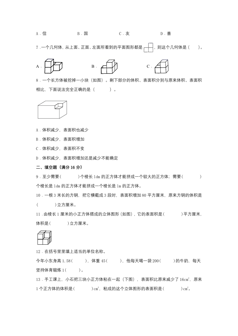 【分层训练】五年级下册数学单元测试-第三单元长方体和正方体(培优卷)人教版(含答案)芝士老师1年前发布关注私信0.11MB9页581263【分层训练】五年级下册数学单元测试-第三单元长方体和正方体(培优卷)人教版(含答案)此内容为免费资源,请登录后查看芝士0 登录查看强烈推荐123网盘下载,非会员不限速如果下载链接失效请联系客服补发如需手机上下载打印,请用手机浏览器打开本站免费资源 第1页 / 共9页 第2页 / 共9页 第3页 / 共9页 该文档为免费文档,您可直接下载完整版进行阅读 © 版权声明 1 如果您找不到想要的资料, 点击这儿 可以查看网站使用手册! 2 可能会帮助到你: 网址导航 | 网站入门 | 获取邀请码 3 如果遇到付费才能看或下载的文章,建议您升级本站VIP会员;全站所有资源任意下,免费看。 4本站资源部分来自网络,由多位老师收集整理,如有侵犯你的权益请 联系站长,我们会第一时间进行审核删除。 5 站内资源为网友个人学习或测试研究使用,未经原版权作者许可,禁止用于任何商业途径!请在下载24小时内删除! THE END五年级资料专区 这套资料真的不错,快分享给您身边最好的朋友吧^_^点赞263 分享QQ空间微博QQ好友海报分享复制链接收藏 可以按Ctrl+D收藏此页面 HI!请登录 登录 注册 搜索 开启精彩搜索 免费内容强烈推荐123网盘下载,非会员不限速如果下载链接失效请联系客服补发如需手机上下载打印,请用手机浏览器打开本站 登录查看默写 (12)高频考点 (1)高分必刷 (0)高中语文 (5)高中英语 (7)高中生物 (5)高中数学 (12)高中地理 (5)高中历史 (5)高中化学 (5)预习 (2)音标 (1)雷锋 (0)阅读 (0)阅兵 (5)钱 (6)量词 (3)部首 (1)逻辑 (12)通用 (0) 小吖麻麻关注 这家伙很懒,什么都没有写... s_juan1关注 这家伙很懒,什么都没有写... kuan关注 这家伙很懒,什么都没有写... evawawawa关注 这家伙很懒,什么都没有写... kele关注 这家伙很懒,什么都没有写... 燕子关注 这家伙很懒,什么都没有写... 四爷关注 这家伙很懒,什么都没有写... 小豆点sun关注 这家伙很懒,什么都没有写... 领取5000T网盘资源 百度网盘5000T网红资源 立即领取 在手机上浏览此页面 登录没有账号?立即注册手机号或邮箱图形验证码验证码发送验证码记住登录账号密码登录 登录用户名/手机号/邮箱登录密码图形验证码记住登录找回密码 | 免密登录 登录注册已有账号,立即登录设置用户名手机号图形验证码验证码发送验证码设置密码重复密码邀请码(选填)注册已阅读并同意用户协议、隐私声明