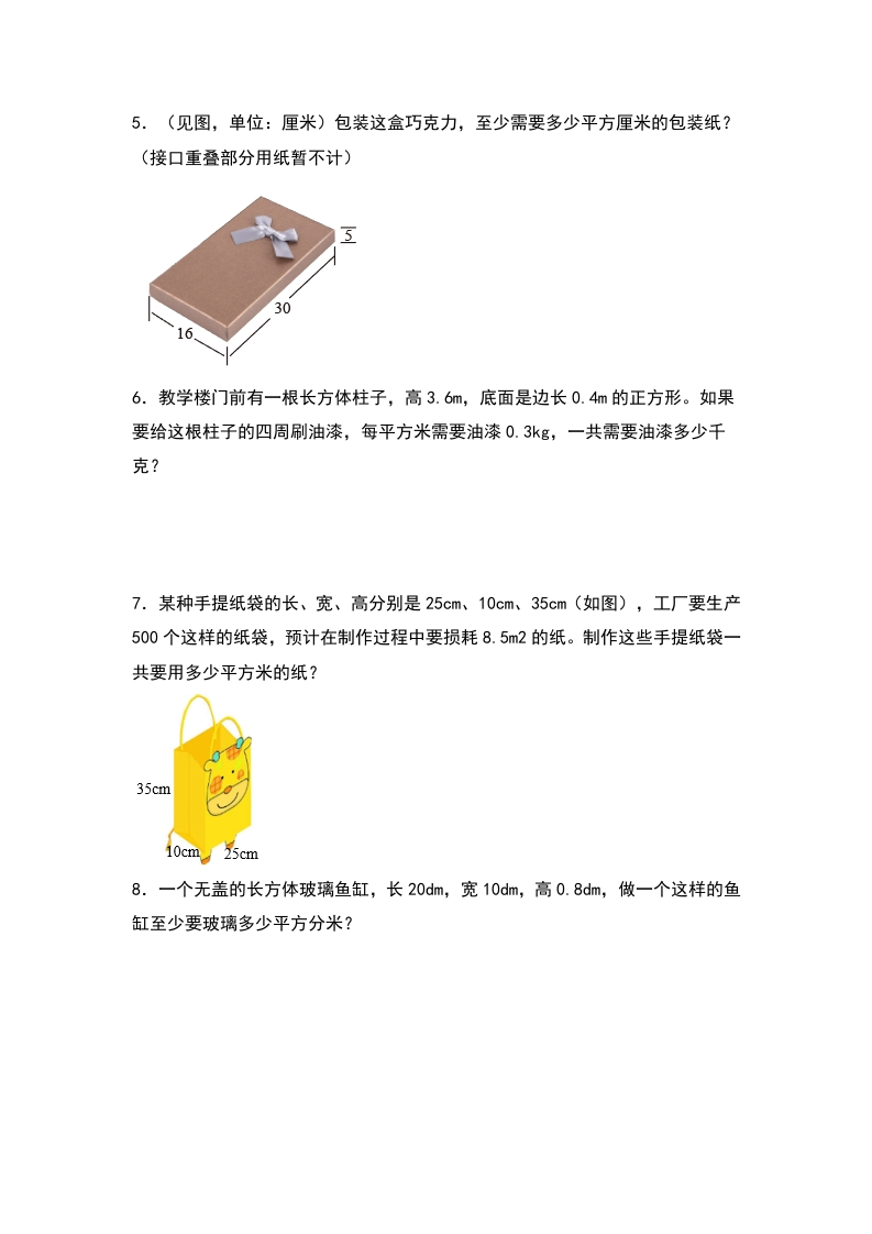 【典型例题系列】五年级数学下册典型例题系列之第三单元:长方体和正方体表面积的生活实际问题专项练习(原卷版)人教版芝士老师1年前发布关注私信99.97KB5页598173【典型例题系列】五年级数学下册典型例题系列之第三单元:长方体和正方体表面积的生活实际问题专项练习(原卷版)人教版此内容为免费资源,请登录后查看芝士0 登录查看强烈推荐123网盘下载,非会员不限速如果下载链接失效请联系客服补发如需手机上下载打印,请用手机浏览器打开本站免费资源 第1页 / 共5页 第2页 / 共5页 第3页 / 共5页 该文档为免费文档,您可直接下载完整版进行阅读 © 版权声明 1 如果您找不到想要的资料, 点击这儿 可以查看网站使用手册! 2 可能会帮助到你: 网址导航 | 网站入门 | 获取邀请码 3 如果遇到付费才能看或下载的文章,建议您升级本站VIP会员;全站所有资源任意下,免费看。 4本站资源部分来自网络,由多位老师收集整理,如有侵犯你的权益请 联系站长,我们会第一时间进行审核删除。 5 站内资源为网友个人学习或测试研究使用,未经原版权作者许可,禁止用于任何商业途径!请在下载24小时内删除! THE END五年级资料专区 这套资料真的不错,快分享给您身边最好的朋友吧^_^点赞173 分享QQ空间微博QQ好友海报分享复制链接收藏 可以按Ctrl+D收藏此页面 HI!请登录 登录 注册 搜索 开启精彩搜索 免费内容强烈推荐123网盘下载,非会员不限速如果下载链接失效请联系客服补发如需手机上下载打印,请用手机浏览器打开本站 登录查看默写 (12)高频考点 (1)高分必刷 (0)高中语文 (5)高中英语 (7)高中生物 (5)高中数学 (12)高中地理 (5)高中历史 (5)高中化学 (5)预习 (2)音标 (1)雷锋 (0)阅读 (0)阅兵 (5)钱 (6)量词 (3)部首 (1)逻辑 (12)通用 (0) 小吖麻麻关注 这家伙很懒,什么都没有写... s_juan1关注 这家伙很懒,什么都没有写... kuan关注 这家伙很懒,什么都没有写... evawawawa关注 这家伙很懒,什么都没有写... kele关注 这家伙很懒,什么都没有写... 燕子关注 这家伙很懒,什么都没有写... 四爷关注 这家伙很懒,什么都没有写... 小豆点sun关注 这家伙很懒,什么都没有写... 领取5000T网盘资源 百度网盘5000T网红资源 立即领取 在手机上浏览此页面 登录没有账号?立即注册手机号或邮箱图形验证码验证码发送验证码记住登录账号密码登录 登录用户名/手机号/邮箱登录密码图形验证码记住登录找回密码 | 免密登录 登录注册已有账号,立即登录设置用户名手机号图形验证码验证码发送验证码设置密码重复密码邀请码(选填)注册已阅读并同意用户协议、隐私声明