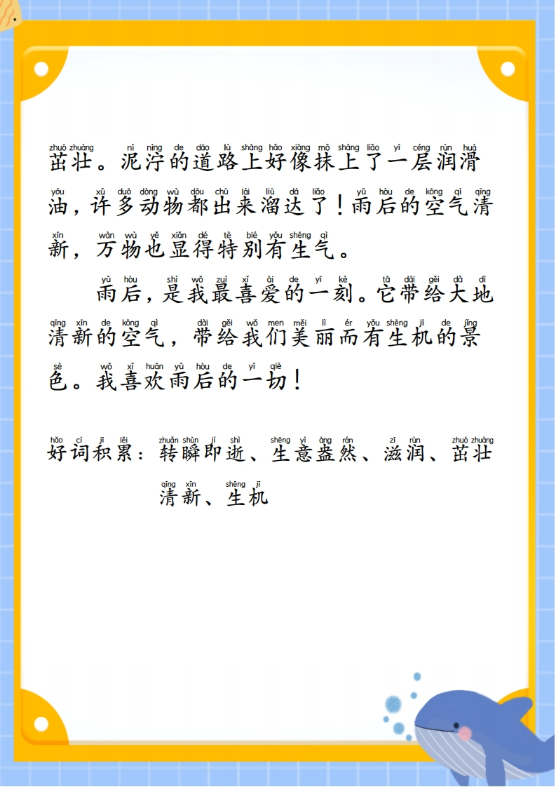 【小学通用】每日晨读-好词好句好段-有注音(35页)芝士老师3个月前更新关注私信11.72MB35页691204【小学通用】每日晨读-好词好句好段-有注音(35页)此内容为付费资源,请付费后查看会员专属资源学期会员免费研学会员免费您暂无购买权限,请先开通会员开通会员强烈推荐123网盘下载,非会员不限速如果下载链接失效请联系客服补发如需手机上下载打印,请用手机浏览器打开本站付费资源 第1页 / 共35页 第2页 / 共35页 第3页 / 共35页 试读已结束,还剩32页,您可下载完整版后进行离线阅读 © 版权声明 1 如果您找不到想要的资料, 点击这儿 可以查看网站使用手册! 2 可能会帮助到你: 网址导航 | 网站入门 | 获取邀请码 3 如果遇到付费才能看或下载的文章,建议您升级本站VIP会员;全站所有资源任意下,免费看。 4本站资源部分来自网络,由多位老师收集整理,如有侵犯你的权益请 联系站长,我们会第一时间进行审核删除。 5 站内资源为网友个人学习或测试研究使用,未经原版权作者许可,禁止用于任何商业途径!请在下载24小时内删除! THE END其它资料资料专区# 晨读 这套资料真的不错,快分享给您身边最好的朋友吧^_^点赞204 分享QQ空间微博QQ好友海报分享复制链接收藏 可以按Ctrl+D收藏此页面 HI!请登录 登录 注册 搜索 开启精彩搜索 付费资源会员专属资源学期会员免费研学会员免费强烈推荐123网盘下载,非会员不限速如果下载链接失效请联系客服补发如需手机上下载打印,请用手机浏览器打开本站您暂无购买权限,请先开通会员开通会员默写 (12)高频考点 (1)高分必刷 (0)高中语文 (5)高中英语 (7)高中生物 (5)高中数学 (12)高中地理 (5)高中历史 (5)高中化学 (5)预习 (2)音标 (1)雷锋 (0)阅读 (0)阅兵 (5)钱 (6)量词 (3)部首 (1)逻辑 (12)通用 (0) 小吖麻麻关注 这家伙很懒,什么都没有写... kele关注 这家伙很懒,什么都没有写... 燕子关注 这家伙很懒,什么都没有写... 四爷关注 这家伙很懒,什么都没有写... 小豆点sun关注 这家伙很懒,什么都没有写... Mouse Dad关注 这家伙很懒,什么都没有写... kuan关注 这家伙很懒,什么都没有写... Wxx08关注 这家伙很懒,什么都没有写... 领取5000T网盘资源 百度网盘5000T网红资源 立即领取 在手机上浏览此页面 登录没有账号?立即注册手机号或邮箱图形验证码验证码发送验证码记住登录账号密码登录 登录用户名/手机号/邮箱登录密码图形验证码记住登录找回密码 | 免密登录 登录注册已有账号,立即登录设置用户名手机号图形验证码验证码发送验证码设置密码重复密码邀请码(选填)注册已阅读并同意用户协议、隐私声明