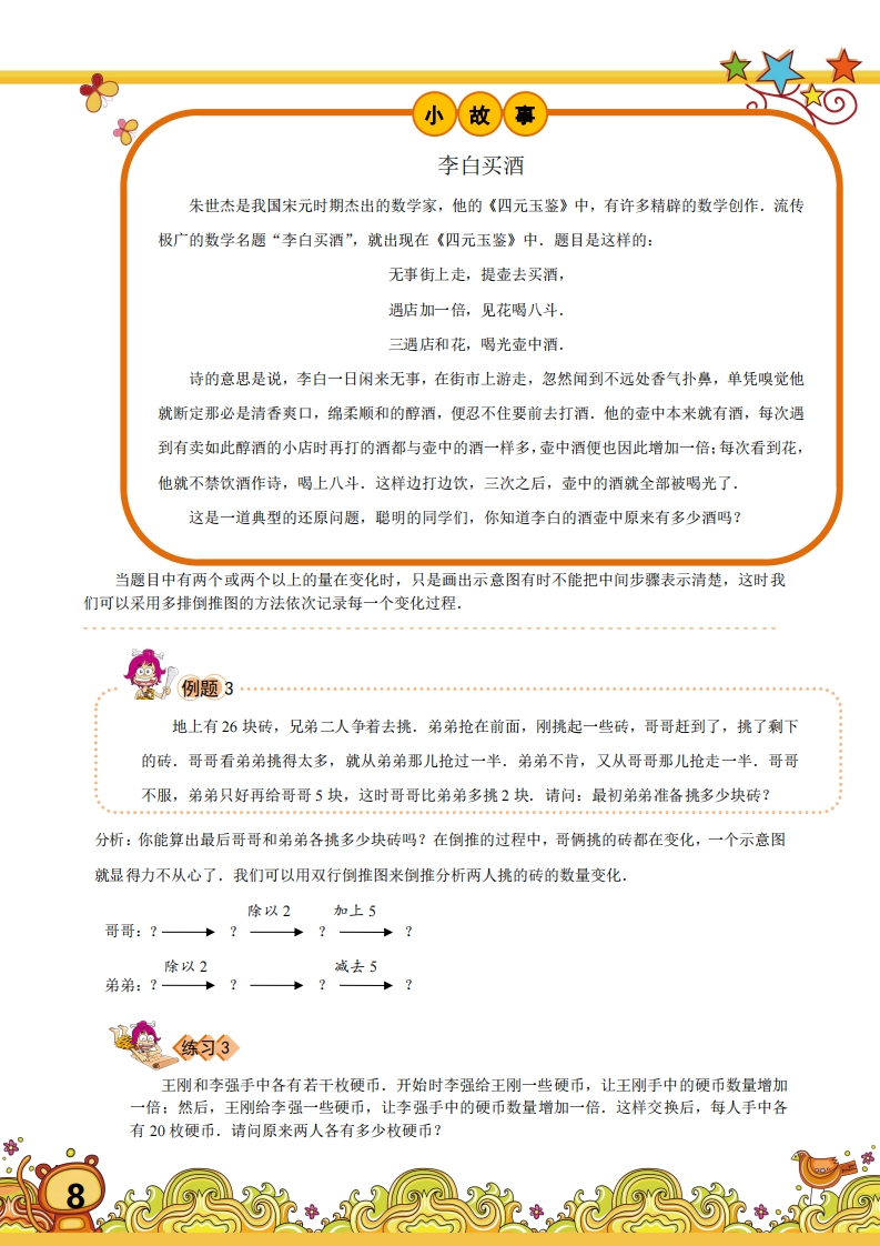 三年级奥数下第14讲-还原问题(带解析)芝士老师1年前发布关注私信1.44MB8页582225三年级奥数下第14讲-还原问题(带解析)此内容为付费资源,请付费后查看会员专属资源学期会员免费研学会员免费您暂无购买权限,请先开通会员开通会员强烈推荐123网盘下载,非会员不限速如果下载链接失效请联系客服补发如需手机上下载打印,请用手机浏览器打开本站付费资源 第1页 / 共8页 第2页 / 共8页 第3页 / 共8页 试读已结束,还剩5页,您可下载完整版后进行离线阅读 © 版权声明 1 如果您找不到想要的资料, 点击这儿 可以查看网站使用手册! 2 可能会帮助到你: 网址导航 | 网站入门 | 获取邀请码 3 如果遇到付费才能看或下载的文章,建议您升级本站VIP会员;全站所有资源任意下,免费看。 4本站资源部分来自网络,由多位老师收集整理,如有侵犯你的权益请 联系站长,我们会第一时间进行审核删除。 5 站内资源为网友个人学习或测试研究使用,未经原版权作者许可,禁止用于任何商业途径!请在下载24小时内删除! THE END小学奥数专题三年级资料专区# 奥数 这套资料真的不错,快分享给您身边最好的朋友吧^_^点赞225 分享QQ空间微博QQ好友海报分享复制链接收藏 可以按Ctrl+D收藏此页面 HI!请登录 登录 注册 搜索 开启精彩搜索 付费资源会员专属资源学期会员免费研学会员免费强烈推荐123网盘下载,非会员不限速如果下载链接失效请联系客服补发如需手机上下载打印,请用手机浏览器打开本站您暂无购买权限,请先开通会员开通会员默写 (12)高频考点 (1)高分必刷 (0)高中语文 (5)高中英语 (7)高中生物 (5)高中数学 (12)高中地理 (5)高中历史 (5)高中化学 (5)预习 (2)音标 (1)雷锋 (0)阅读 (0)阅兵 (5)钱 (6)量词 (3)部首 (1)逻辑 (12)通用 (0) 小吖麻麻关注 这家伙很懒,什么都没有写... kele关注 这家伙很懒,什么都没有写... 燕子关注 这家伙很懒,什么都没有写... 四爷关注 这家伙很懒,什么都没有写... 小豆点sun关注 这家伙很懒,什么都没有写... Mouse Dad关注 这家伙很懒,什么都没有写... kuan关注 这家伙很懒,什么都没有写... Wxx08关注 这家伙很懒,什么都没有写... 领取5000T网盘资源 百度网盘5000T网红资源 立即领取 在手机上浏览此页面 登录没有账号?立即注册手机号或邮箱图形验证码验证码发送验证码记住登录账号密码登录 登录用户名/手机号/邮箱登录密码图形验证码记住登录找回密码 | 免密登录 登录注册已有账号,立即登录设置用户名手机号图形验证码验证码发送验证码设置密码重复密码邀请码(选填)注册已阅读并同意用户协议、隐私声明