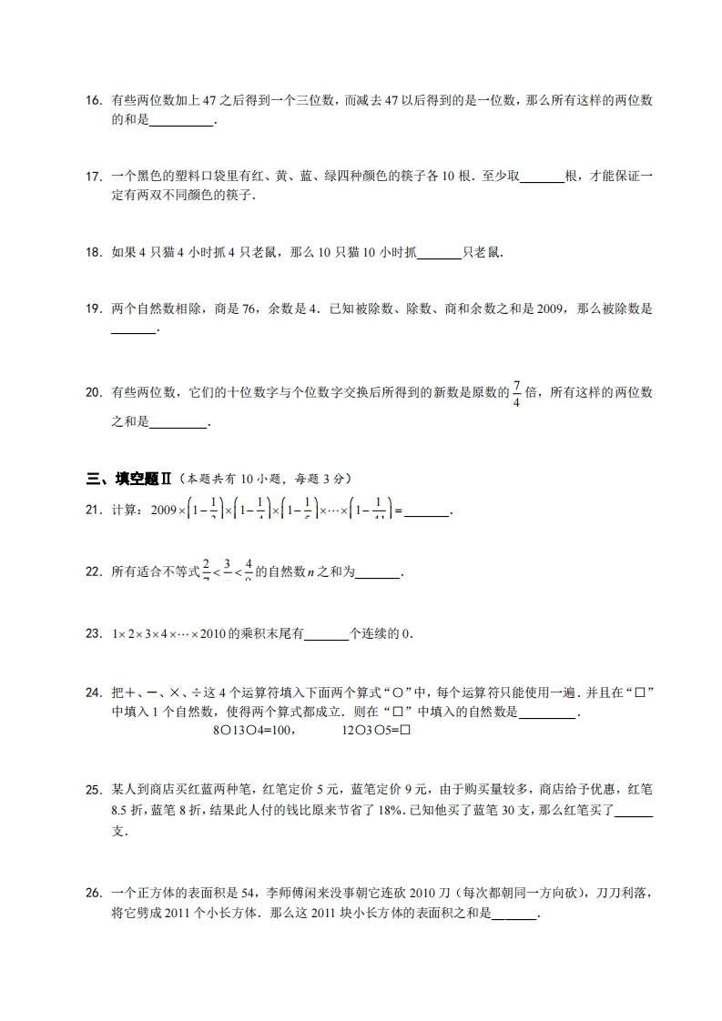 六年级奥数下第22讲-小升初总复习模拟测试九(带解析)芝士老师1年前发布关注私信0.49MB7页702275六年级奥数下第22讲-小升初总复习模拟测试九(带解析)此内容为付费资源,请付费后查看会员专属资源学期会员免费研学会员免费您暂无购买权限,请先开通会员开通会员强烈推荐123网盘下载,非会员不限速如果下载链接失效请联系客服补发如需手机上下载打印,请用手机浏览器打开本站付费资源 第1页 / 共7页 第2页 / 共7页 第3页 / 共7页 试读已结束,还剩4页,您可下载完整版后进行离线阅读 © 版权声明 1 如果您找不到想要的资料, 点击这儿 可以查看网站使用手册! 2 可能会帮助到你: 网址导航 | 网站入门 | 获取邀请码 3 如果遇到付费才能看或下载的文章,建议您升级本站VIP会员;全站所有资源任意下,免费看。 4本站资源部分来自网络,由多位老师收集整理,如有侵犯你的权益请 联系站长,我们会第一时间进行审核删除。 5 站内资源为网友个人学习或测试研究使用,未经原版权作者许可,禁止用于任何商业途径!请在下载24小时内删除! THE END小学奥数专题六年级资料专区# 奥数 这套资料真的不错,快分享给您身边最好的朋友吧^_^点赞275 分享QQ空间微博QQ好友海报分享复制链接收藏 可以按Ctrl+D收藏此页面 HI!请登录 登录 注册 搜索 开启精彩搜索 付费资源会员专属资源学期会员免费研学会员免费强烈推荐123网盘下载,非会员不限速如果下载链接失效请联系客服补发如需手机上下载打印,请用手机浏览器打开本站您暂无购买权限,请先开通会员开通会员默写 (12)高频考点 (1)高分必刷 (0)高中语文 (5)高中英语 (7)高中生物 (5)高中数学 (12)高中地理 (5)高中历史 (5)高中化学 (5)预习 (2)音标 (1)雷锋 (0)阅读 (0)阅兵 (5)钱 (6)量词 (3)部首 (1)逻辑 (12)通用 (0) 小吖麻麻关注 这家伙很懒,什么都没有写... kele关注 这家伙很懒,什么都没有写... 燕子关注 这家伙很懒,什么都没有写... 四爷关注 这家伙很懒,什么都没有写... 小豆点sun关注 这家伙很懒,什么都没有写... Mouse Dad关注 这家伙很懒,什么都没有写... kuan关注 这家伙很懒,什么都没有写... Wxx08关注 这家伙很懒,什么都没有写... 领取5000T网盘资源 百度网盘5000T网红资源 立即领取 在手机上浏览此页面 登录没有账号?立即注册手机号或邮箱图形验证码验证码发送验证码记住登录账号密码登录 登录用户名/手机号/邮箱登录密码图形验证码记住登录找回密码 | 免密登录 登录注册已有账号,立即登录设置用户名手机号图形验证码验证码发送验证码设置密码重复密码邀请码(选填)注册已阅读并同意用户协议、隐私声明