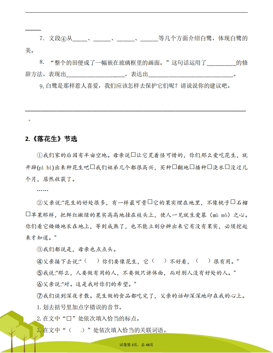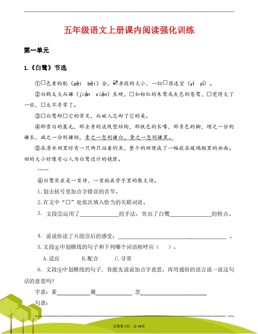 五(上)阅读理解专项练习芝士老师12个月前发布关注私信1.14MB69页648227五(上)阅读理解专项练习此内容为付费资源,请付费后查看会员专属资源学期会员免费研学会员免费您暂无购买权限,请先开通会员开通会员强烈推荐123网盘下载,非会员不限速如果下载链接失效请联系客服补发如需手机上下载打印,请用手机浏览器打开本站付费资源 第1页 / 共69页 第2页 / 共69页 第3页 / 共69页 试读已结束,还剩66页,您可下载完整版后进行离线阅读 © 版权声明 1 如果您找不到想要的资料, 点击这儿 可以查看网站使用手册! 2 可能会帮助到你: 网址导航 | 网站入门 | 获取邀请码 3 如果遇到付费才能看或下载的文章,建议您升级本站VIP会员;全站所有资源任意下,免费看。 4本站资源部分来自网络,由多位老师收集整理,如有侵犯你的权益请 联系站长,我们会第一时间进行审核删除。 5 站内资源为网友个人学习或测试研究使用,未经原版权作者许可,禁止用于任何商业途径!请在下载24小时内删除! THE END五年级资料专区 这套资料真的不错,快分享给您身边最好的朋友吧^_^点赞227 分享QQ空间微博QQ好友海报分享复制链接收藏 可以按Ctrl+D收藏此页面 HI!请登录 登录 注册 搜索 开启精彩搜索 付费资源会员专属资源学期会员免费研学会员免费强烈推荐123网盘下载,非会员不限速如果下载链接失效请联系客服补发如需手机上下载打印,请用手机浏览器打开本站您暂无购买权限,请先开通会员开通会员默写 (12)高频考点 (1)高分必刷 (0)高中语文 (5)高中英语 (7)高中生物 (5)高中数学 (12)高中地理 (5)高中历史 (5)高中化学 (5)预习 (2)音标 (1)雷锋 (0)阅读 (0)阅兵 (5)钱 (6)量词 (3)部首 (1)逻辑 (12)通用 (0) s_juan1关注 这家伙很懒,什么都没有写... 小吖麻麻关注 这家伙很懒,什么都没有写... kele关注 这家伙很懒,什么都没有写... 燕子关注 这家伙很懒,什么都没有写... 四爷关注 这家伙很懒,什么都没有写... 小豆点sun关注 这家伙很懒,什么都没有写... Mouse Dad关注 这家伙很懒,什么都没有写... kuan关注 这家伙很懒,什么都没有写... 领取5000T网盘资源 百度网盘5000T网红资源 立即领取 在手机上浏览此页面 登录没有账号?立即注册手机号或邮箱图形验证码验证码发送验证码记住登录账号密码登录 登录用户名/手机号/邮箱登录密码图形验证码记住登录找回密码 | 免密登录 登录注册已有账号,立即登录设置用户名手机号图形验证码验证码发送验证码设置密码重复密码邀请码(选填)注册已阅读并同意用户协议、隐私声明