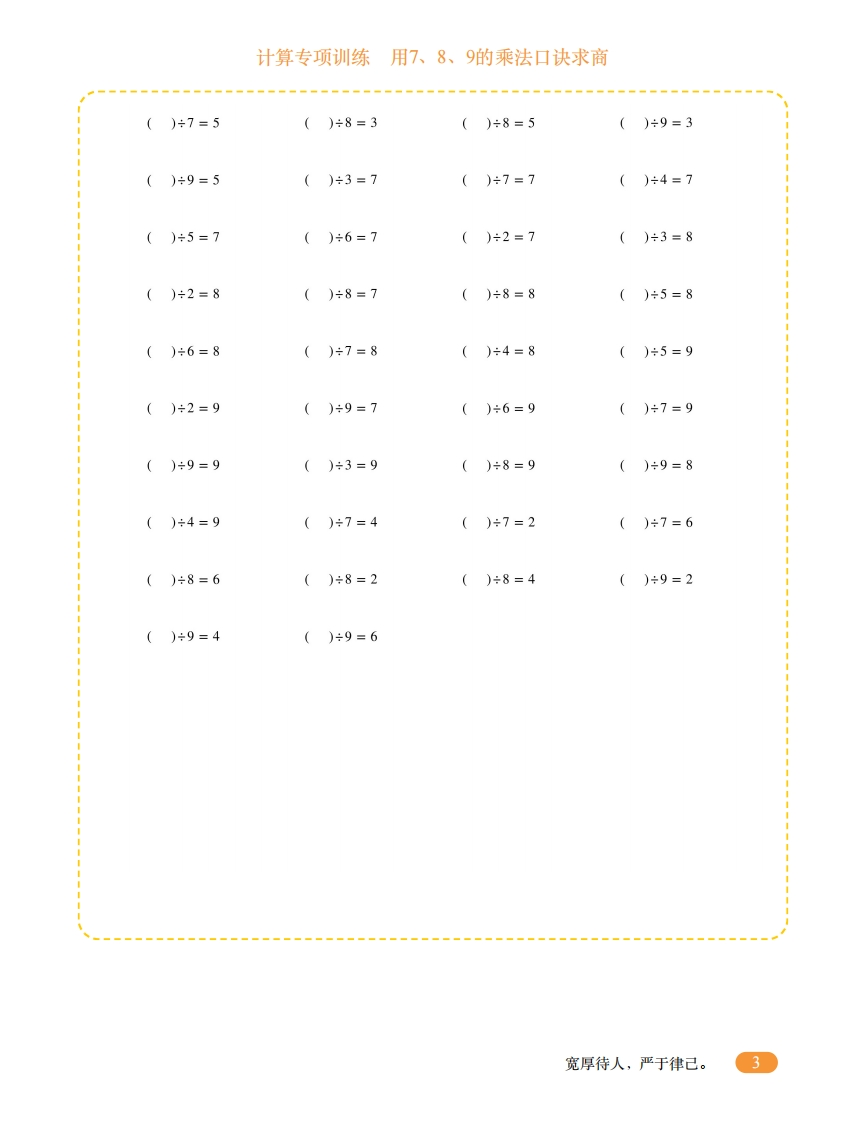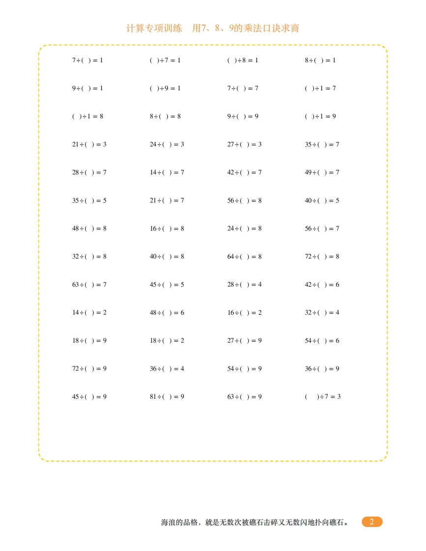 二年级计算专项训练13(用7、8、9的乘法口诀求商)芝士老师1年前发布关注私信1.48MB6页570107二年级计算专项训练13(用7、8、9的乘法口诀求商)此内容为付费资源,请付费后查看会员专属资源学期会员免费研学会员免费您暂无购买权限,请先开通会员开通会员强烈推荐123网盘下载,非会员不限速如果下载链接失效请联系客服补发如需手机上下载打印,请用手机浏览器打开本站付费资源 第1页 / 共6页 第2页 / 共6页 第3页 / 共6页 试读已结束,还剩3页,您可下载完整版后进行离线阅读 © 版权声明 1 如果您找不到想要的资料, 点击这儿 可以查看网站使用手册! 2 可能会帮助到你: 网址导航 | 网站入门 | 获取邀请码 3 如果遇到付费才能看或下载的文章,建议您升级本站VIP会员;全站所有资源任意下,免费看。 4本站资源部分来自网络,由多位老师收集整理,如有侵犯你的权益请 联系站长,我们会第一时间进行审核删除。 5 站内资源为网友个人学习或测试研究使用,未经原版权作者许可,禁止用于任何商业途径!请在下载24小时内删除! THE END二年级资料专区# 2年级# 计算训练, 这套资料真的不错,快分享给您身边最好的朋友吧^_^点赞107 分享QQ空间微博QQ好友海报分享复制链接收藏 可以按Ctrl+D收藏此页面 HI!请登录 登录 注册 搜索 开启精彩搜索 付费资源会员专属资源学期会员免费研学会员免费强烈推荐123网盘下载,非会员不限速如果下载链接失效请联系客服补发如需手机上下载打印,请用手机浏览器打开本站您暂无购买权限,请先开通会员开通会员默写 (12)高频考点 (1)高分必刷 (0)高中语文 (5)高中英语 (7)高中生物 (5)高中数学 (12)高中地理 (5)高中历史 (5)高中化学 (5)预习 (2)音标 (1)雷锋 (0)阅读 (0)阅兵 (5)钱 (6)量词 (3)部首 (1)逻辑 (12)通用 (0) s_juan1关注 这家伙很懒,什么都没有写... 有有关注 这家伙很懒,什么都没有写... 考拉妈咪关注 这家伙很懒,什么都没有写... 好东西关注 这家伙很懒,什么都没有写... 张老师关注 这家伙很懒,什么都没有写... 我来了关注 这家伙很懒,什么都没有写... LLLLLSSSSS关注 这家伙很懒,什么都没有写... 小豆点sun关注 这家伙很懒,什么都没有写... 领取5000T网盘资源 百度网盘5000T网红资源 立即领取 在手机上浏览此页面 登录没有账号?立即注册手机号或邮箱图形验证码验证码发送验证码记住登录账号密码登录 登录用户名/手机号/邮箱登录密码图形验证码记住登录找回密码 | 免密登录 登录注册已有账号,立即登录设置用户名手机号图形验证码验证码发送验证码设置密码重复密码邀请码(选填)注册已阅读并同意用户协议、隐私声明