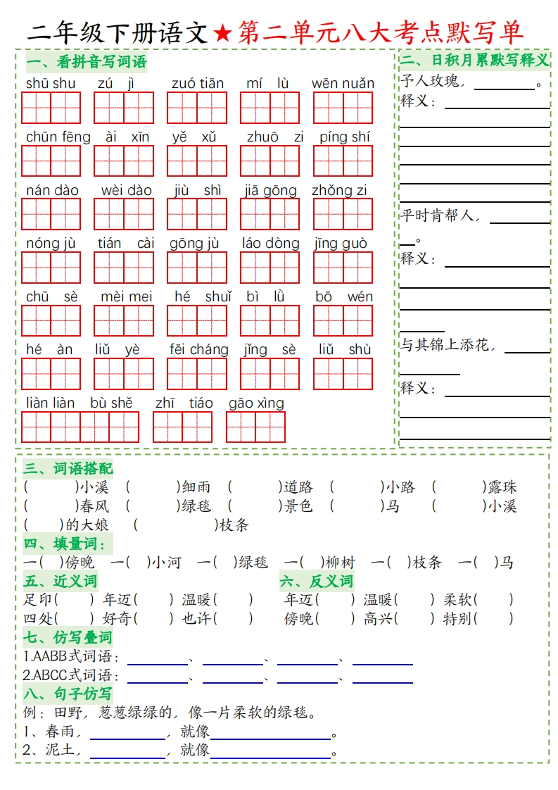 二年级下册语文八大考点默写单空白芝士老师9个月前发布关注私信1MB8页699215二年级下册语文八大考点默写单空白此内容为付费资源,请付费后查看会员专属资源学期会员免费研学会员免费您暂无购买权限,请先开通会员开通会员强烈推荐123网盘下载,非会员不限速如果下载链接失效请联系客服补发如需手机上下载打印,请用手机浏览器打开本站付费资源 第1页 / 共8页 第2页 / 共8页 第3页 / 共8页 试读已结束,还剩5页,您可下载完整版后进行离线阅读 © 版权声明 1 如果您找不到想要的资料, 点击这儿 可以查看网站使用手册! 2 可能会帮助到你: 网址导航 | 网站入门 | 获取邀请码 3 如果遇到付费才能看或下载的文章,建议您升级本站VIP会员;全站所有资源任意下,免费看。 4本站资源部分来自网络,由多位老师收集整理,如有侵犯你的权益请 联系站长,我们会第一时间进行审核删除。 5 站内资源为网友个人学习或测试研究使用,未经原版权作者许可,禁止用于任何商业途径!请在下载24小时内删除! THE END二年级资料专区 这套资料真的不错,快分享给您身边最好的朋友吧^_^点赞215 分享QQ空间微博QQ好友海报分享复制链接收藏 可以按Ctrl+D收藏此页面 HI!请登录 登录 注册 搜索 开启精彩搜索 付费资源会员专属资源学期会员免费研学会员免费强烈推荐123网盘下载,非会员不限速如果下载链接失效请联系客服补发如需手机上下载打印,请用手机浏览器打开本站您暂无购买权限,请先开通会员开通会员默写 (12)高频考点 (1)高分必刷 (0)高中语文 (5)高中英语 (7)高中生物 (5)高中数学 (12)高中地理 (5)高中历史 (5)高中化学 (5)预习 (2)音标 (1)雷锋 (0)阅读 (0)阅兵 (5)钱 (6)量词 (3)部首 (1)逻辑 (12)通用 (0) 小吖麻麻关注 这家伙很懒,什么都没有写... evawawawa关注 这家伙很懒,什么都没有写... s_juan1关注 这家伙很懒,什么都没有写... kele关注 这家伙很懒,什么都没有写... 燕子关注 这家伙很懒,什么都没有写... 四爷关注 这家伙很懒,什么都没有写... 小豆点sun关注 这家伙很懒,什么都没有写... Mouse Dad关注 这家伙很懒,什么都没有写... 领取5000T网盘资源 百度网盘5000T网红资源 立即领取 在手机上浏览此页面 登录没有账号?立即注册手机号或邮箱图形验证码验证码发送验证码记住登录账号密码登录 登录用户名/手机号/邮箱登录密码图形验证码记住登录找回密码 | 免密登录 登录注册已有账号,立即登录设置用户名手机号图形验证码验证码发送验证码设置密码重复密码邀请码(选填)注册已阅读并同意用户协议、隐私声明